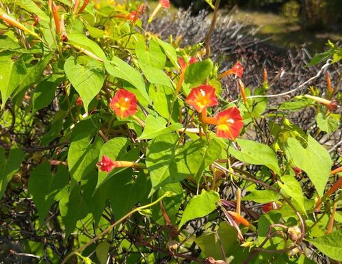 上の写真は、Ymobileスマホのエクスペディア8で撮影しました。江戸末期に観賞用として渡来して野生化し、最近あちこちの空き地や土手などで見かけるようになった、旺盛につるを伸ばしながら次々と咲かせる5角形の朱赤色のかわいい一日花。10月21日の誕…