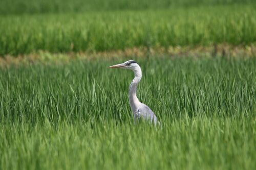 上の写真は、キヤノンEOS7D Mark2にシグマAPO 150-500mm F5-6.3 DG OS HSMを装着して手持ち撮影しました。 下沼田の田圃に佇むアオサギです。