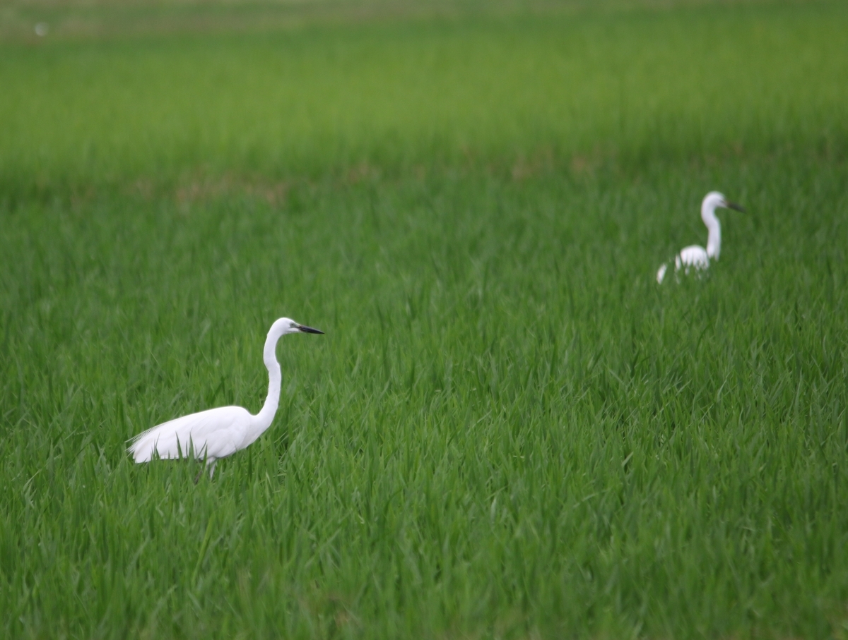 2023-07-02 2羽のチュウダイサギ 上の写真は、キヤノンEOS7D Mark2にシグマAPO 150-500mm F5-6.3 DG OS HSMを装着して手持ち撮影しました。 6月27日中沼田の田んぼに2羽のチュウダイサギがいました。鳥たちの繁殖の季節です。